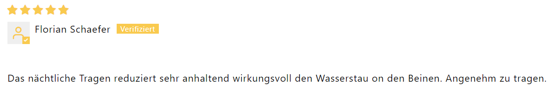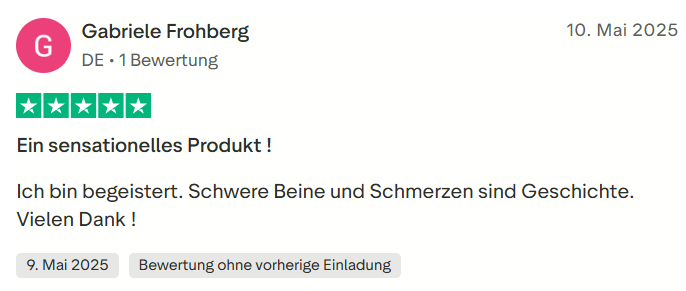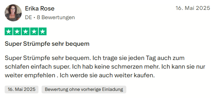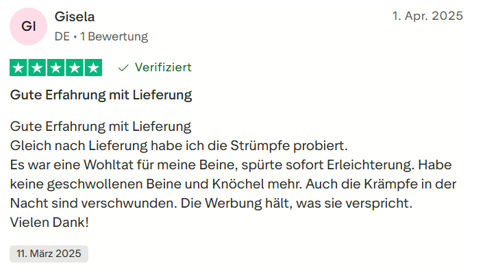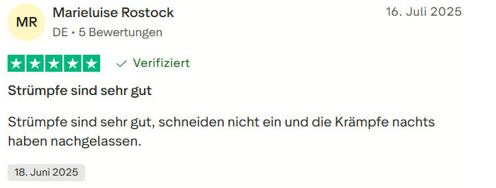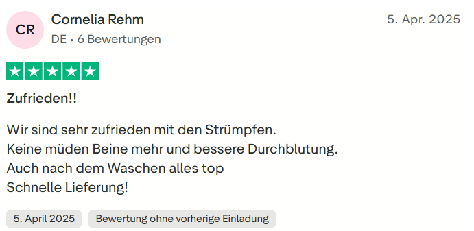 "Ich hatte schon lange Probleme mit schweren Beinen und sichtbaren Venen. Seit ich die Wielbert™ Strümpfe regelmäßig trage, hat sich mein Wohlbefinden deutlich verbessert. Überraschenderweise sind auch meine nächtlichen Krämpfe verschwunden – das war für mich ein echter Wendepunkt."
