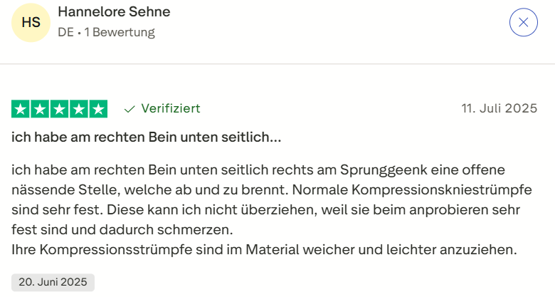 Ulrike T. hatte jahrelang mit geschwollenen Füßen und Beinen zu kämpfen, besonders nach langen Tagen. Herkömmliche Strümpfe schnitten ein und verschärften die Schwellungen.